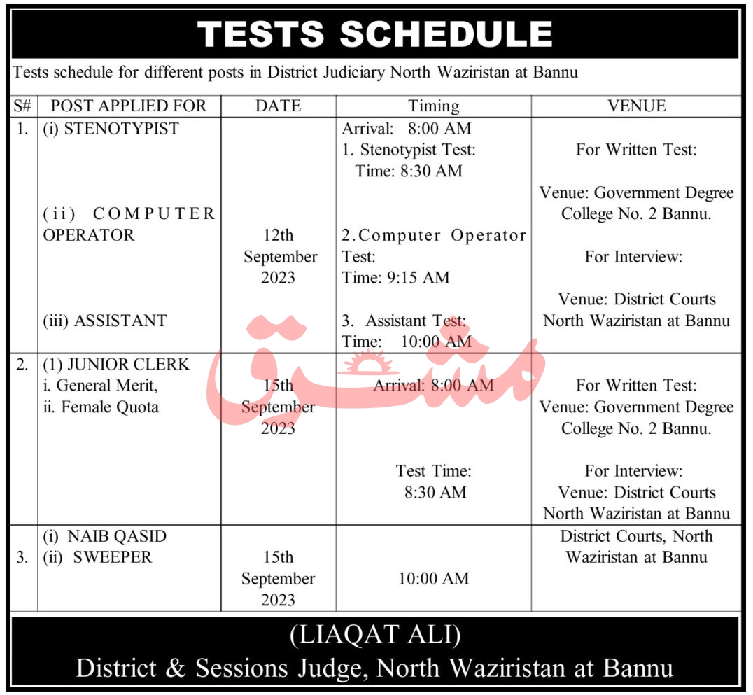 Vacant posts including naib qasid, sweeper, assistant, stenotypist, junior clerk and computer operator are announced in District & Session Judge Bannu, bannu Khyber Pakhtunkhwa KPK Pakistan as per 24 August 2023 advertisement in daily Other Newspaper. Educational qualifications required Middle, Matric, Bachelor, Intermediate and Others etc.