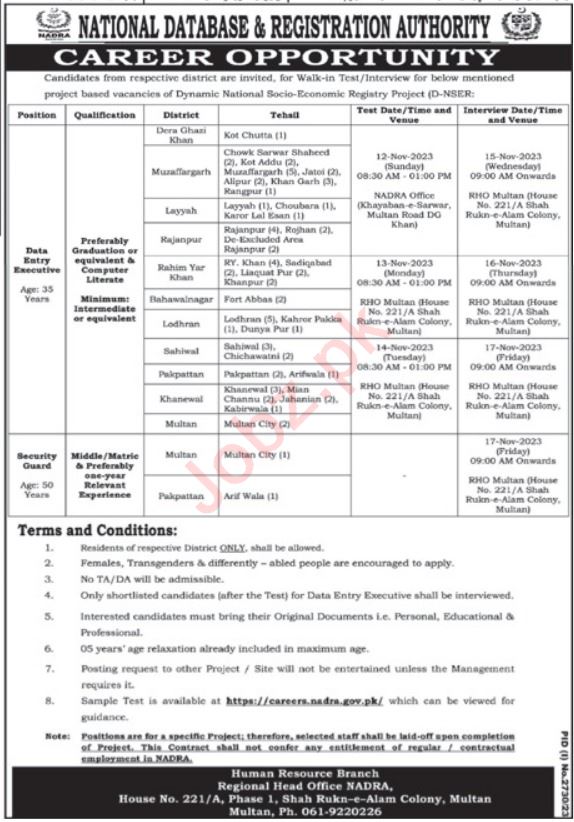 National Database & Registration Authority NADRA invites applications for job positions advertised in daily Khabrain dated 5 November 2023 for following vacancies in Dera Ghazi Khan, muzaffargarh, dera ghazi khan, layyah, khanewal, multan, pakpattan, rahim yar khan, rajanpur, sahiwal, lodhran and bahawalnagar Punjab Pakistan.