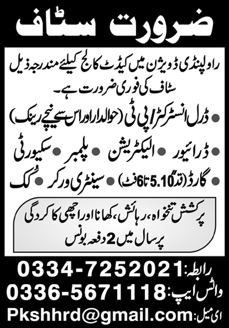Vacant posts including drill instructor, security guard, sanitary worker, electrician, cook, plumber, pt and driver are announced in Cadet College Rawalpindi, rawalpindi Punjab Pakistan as per 1 May 2022 advertisement in daily Nawaiwaqt Newspaper. Preferred Education is Primary, Others, Middle, Matric and Intermediate etc.