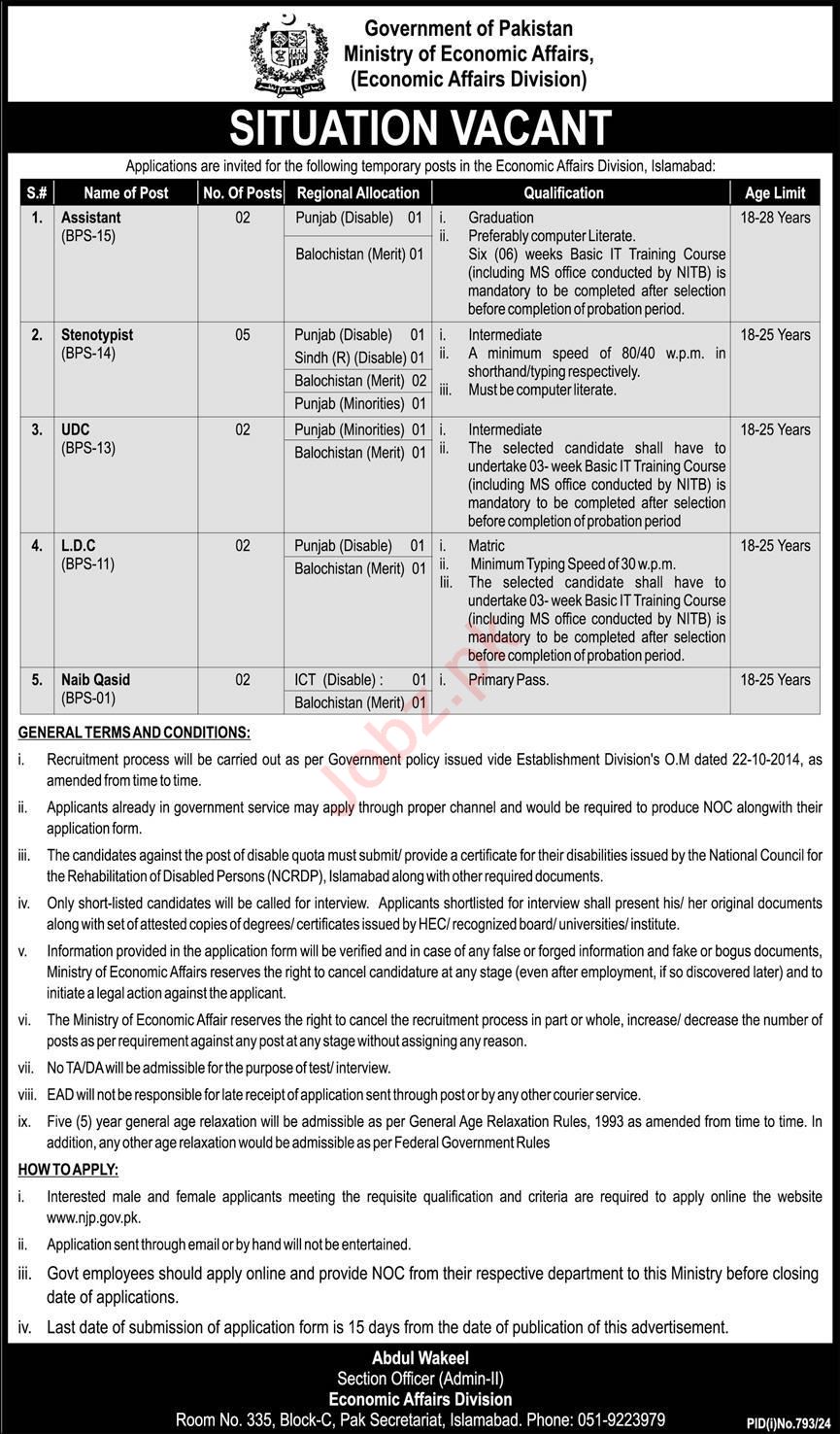 Ministry of Economic Affairs Islamabad, islamabad Islamabad Pakistan invites applications from eligible candidates for the post of stenotypist, asssitant, naib qasid, udc and ldc as per advertisement of August 4, 2024 published in daily Express Newspaper. Primary, Bachelor, Intermediate and Matric etc. educational qualification will be preferred.