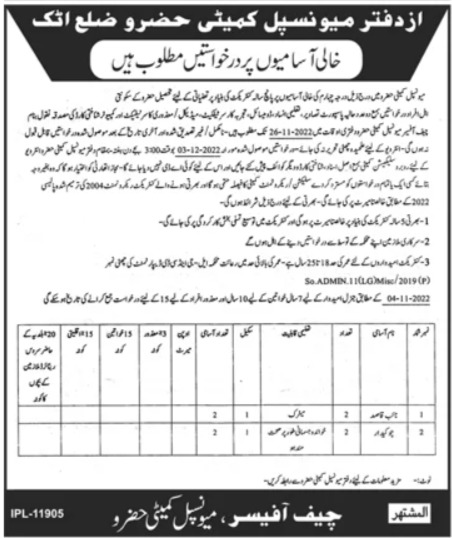 Municipal Committee is looking for candidates for following posts as per job advertisement published in daily Dunya Newspaper of November 18, 2022 for location Hazro, hazro Punjab Pakistan: