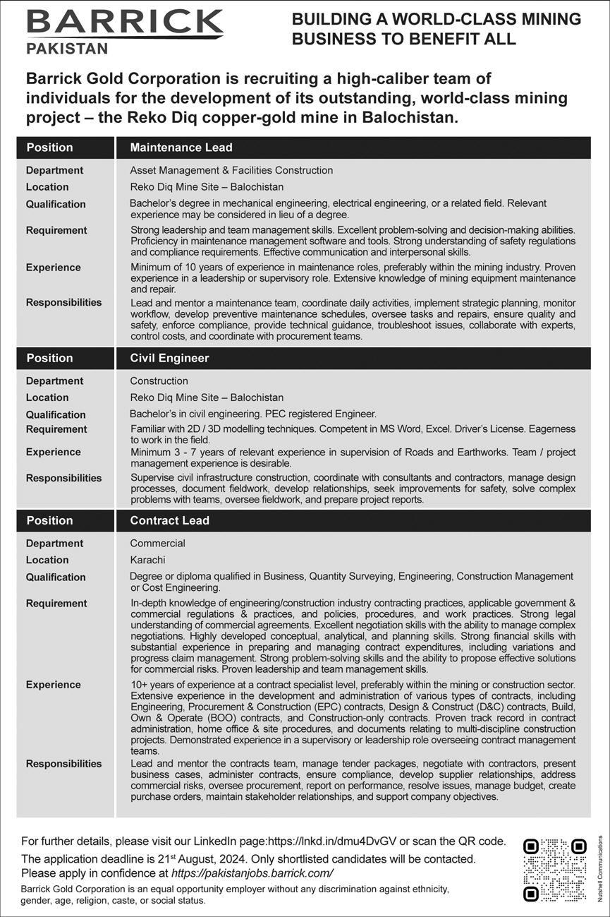 Barrick Pakistan Chaghi, chaghi and karachi Balochistan Pakistan invites applications from eligible candidates for the post of maintenance lead, contract lead and civil engineer as per advertisement of August 7, 2024 published in daily Express Newspaper. Candidates with Bachelor, Others and B.E etc. educational background will be preferred.