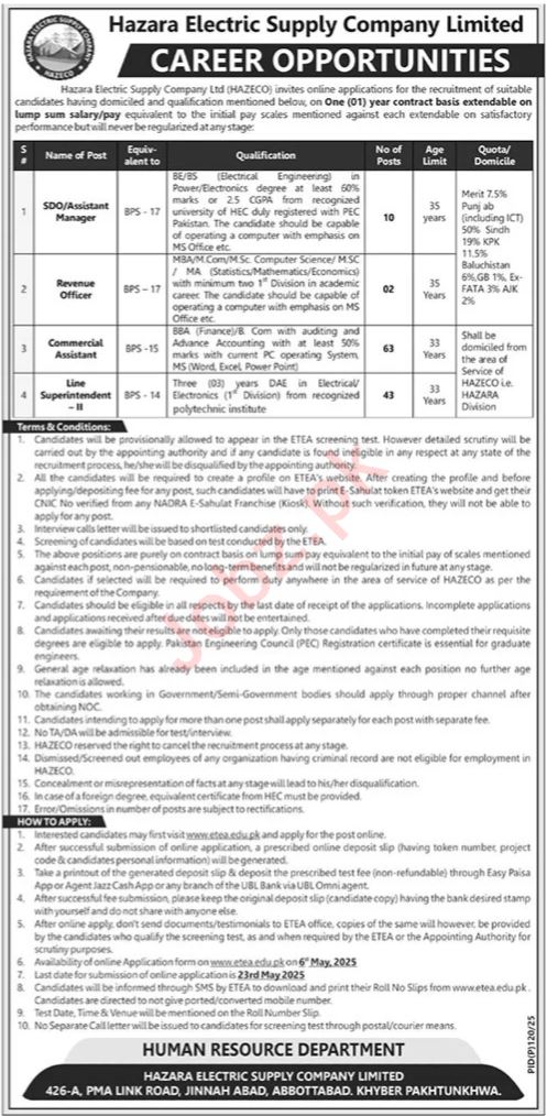 Hazara Electric Supply Company HAZECO PMA Road Abbottabad, abbottabad Khyber Pakhtunkhwa KPK Pakistan invites applications from eligible candidates for the post of line superintendent, revenue officer, commercial assistant, sdo and assistant manager as per advertisement of May 4, 2025 published in daily The News Newspaper. Persons with M.com, B.E, Bachelor, MBA, B.com, DAE and BBA etc. education can apply.