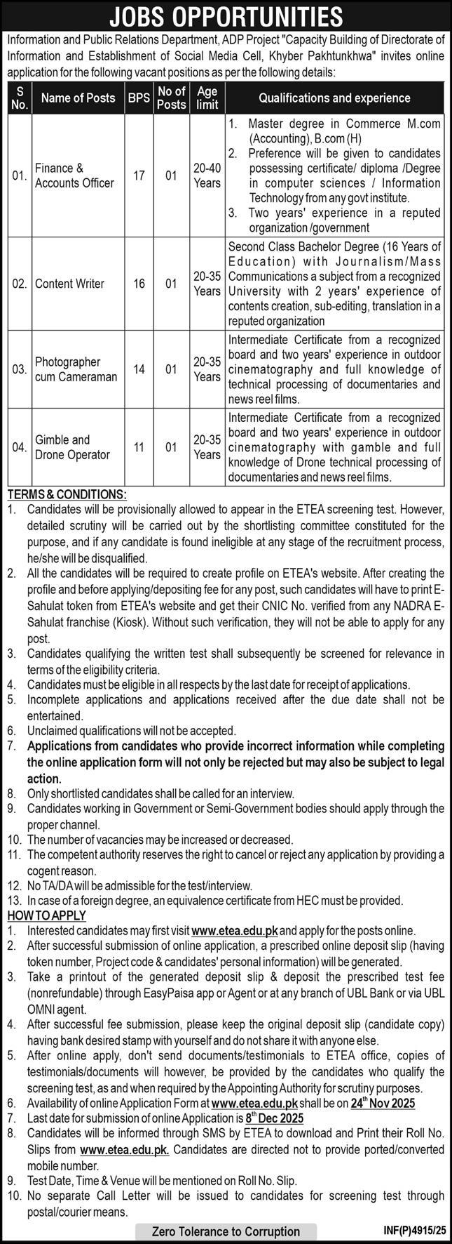 Information & Public Relations Department Peshawar, peshawar Khyber Pakhtunkhwa KPK Pakistan invites applications from eligible candidates for the post of gimble drone operator, finance accounts officer, content writer and photographer cum cameraman as per advertisement of November 23, 2025 published in daily Express Newspaper. Candidates with Master, Intermediate and Bachelor etc. educational background will be preferred.