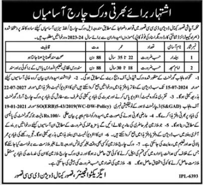 Vacant posts including imam masjid and beldar are announced in Irrigation Department Kasur, kasur Punjab Pakistan as per 5 July 2024 advertisement in daily Jang Newspaper. Preferred Education is Others, Intermediate, Middle and Primary etc.