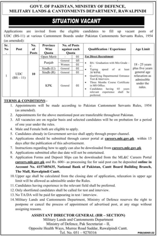 Latest Military Lands and Cantonment Department Admin Clerical Posts Rawalpindi 2025
