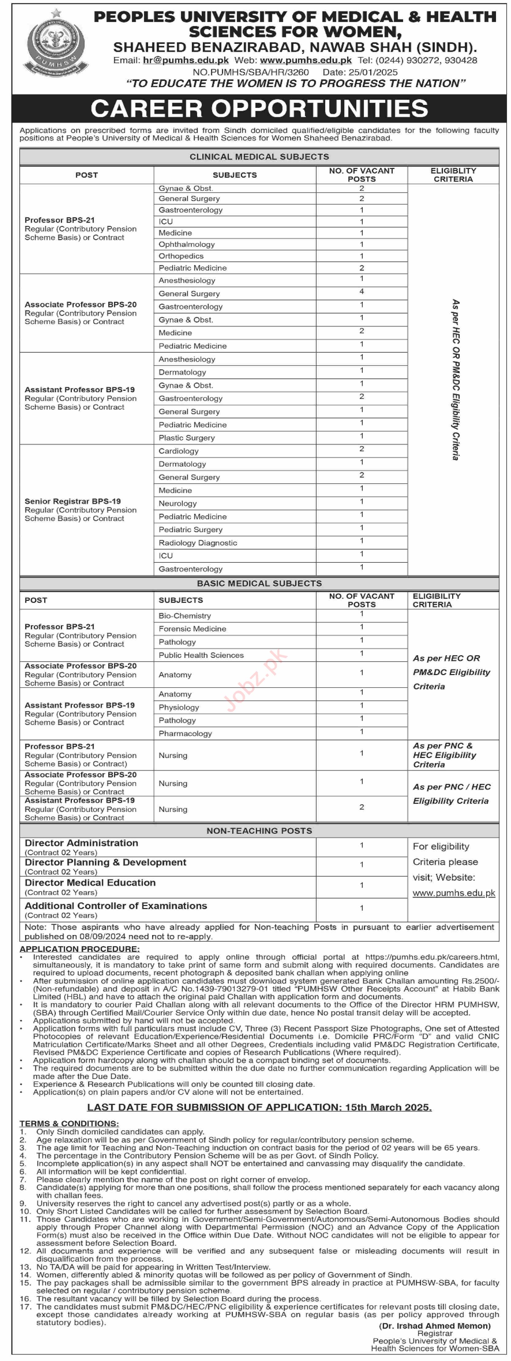Vacant posts including professor, assistant professor, associate professor, registrar, director medical education, director planning development, additional controller of examination and director administration are announced in Peoples University of Medical and Health Sciences for Women Nawabshah, nawabshah Sindh Pakistan as per 26 January 2025 advertisement in daily Dawn Newspaper. Preferred Education is Bachelor, Master, Mphil, MBBS and MS etc.
