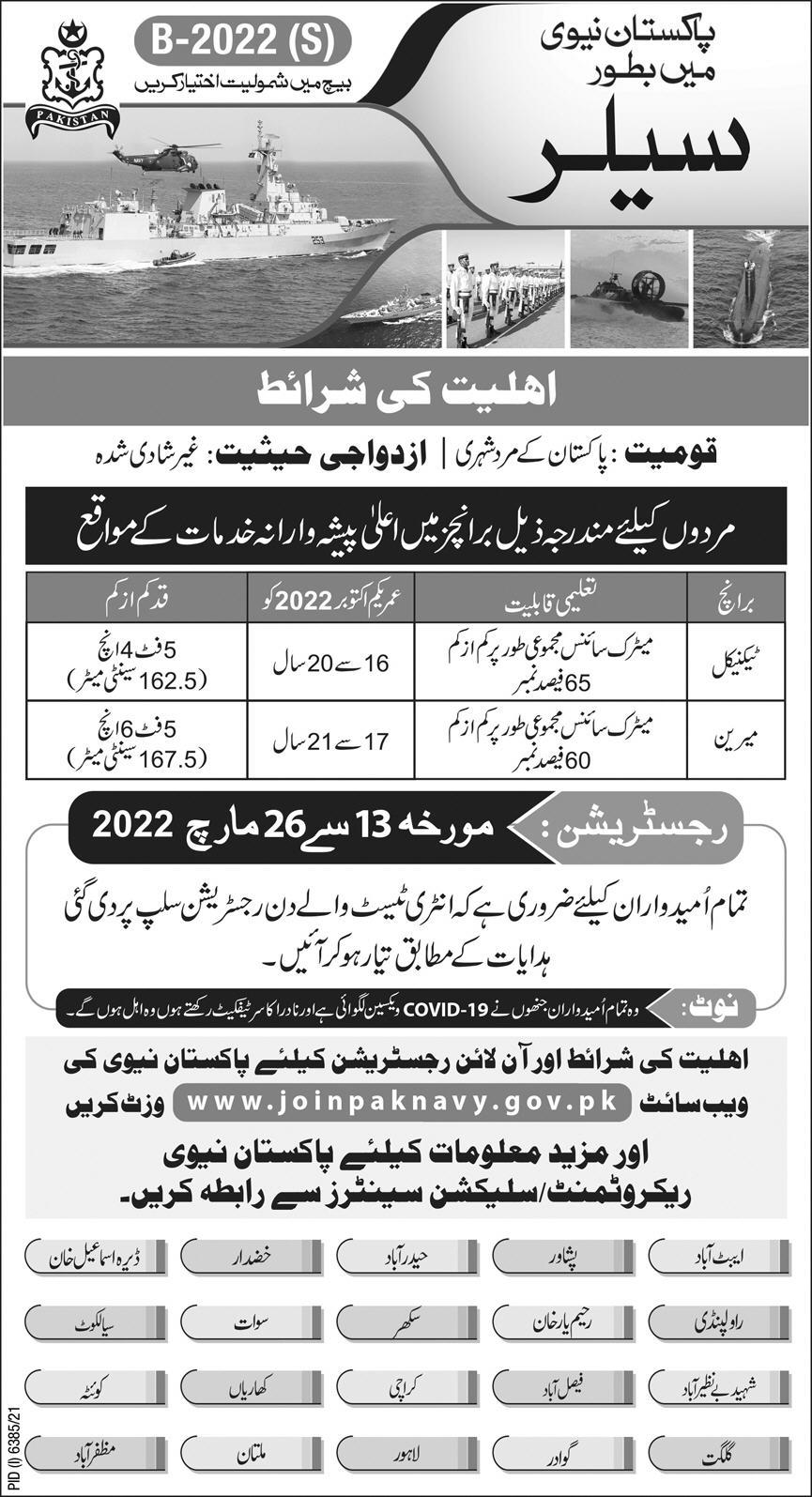 Pakistan Navy invites applications for job positions advertised in daily Express dated 13 March 2022 for following vacancies in Rawalpindi, kharian, karachi, sialkot, lahore, gwadar, sukkur, gilgit, hyderabad, muzaffarabad, khuzdar, quetta, swat, abbottabad, rawalpindi, benazirabad, rahim yar khan, multan, peshawar, faisalabad and dera ismail khan Punjab Pakistan.