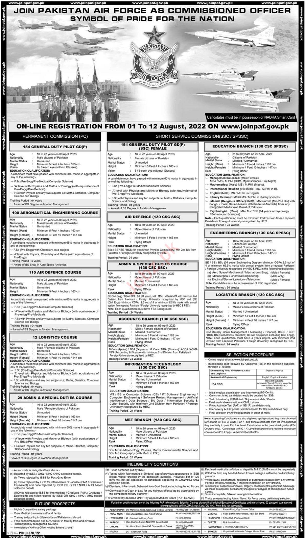 Pakistan Air Force PAF jobs advertisement dated about 31 July 2022 in daily The News Newspaper invites application for the vacant post of aeronautical engineering course, general duty pilot gdp female, logistics course, air defence officer, general duty pilot dgp, logistics branch officer, flying officer, commissioned officer, engineer, met branch, accounts branch officer and admin special duties course in Islamabad, swat, multan, hyderabad, islamabad, karachi, muzaffarabad, quetta, peshawar, gilgit and lahore Islamabad Pakistan. Preferred Education is BBA, MBA, MIT, Bachelor, Master, MCS and BCS etc.