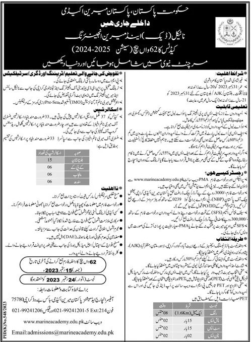 Vacancies in Pakistan Marine Academy Advertisement August 2023