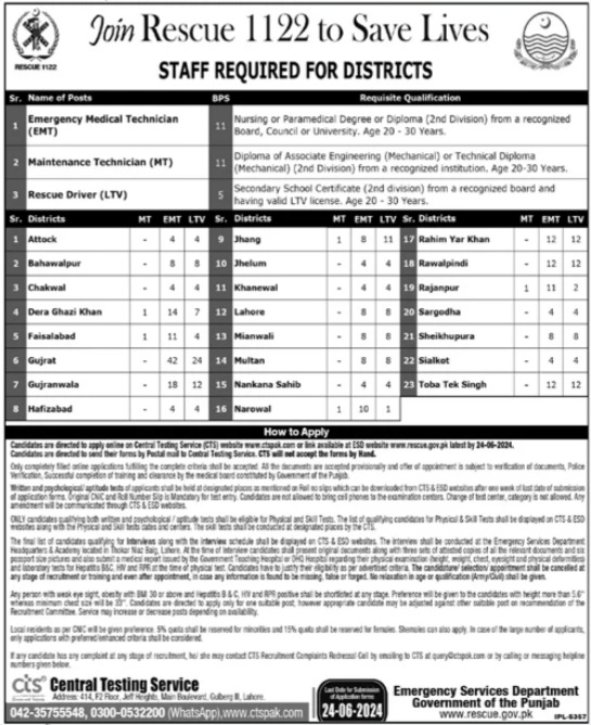 Punjab Emergency Service Rescue 1122 is looking for candidates for following posts as per job advertisement published in daily Jang Newspaper of June 6, 2024 for location Lahore, bahawalpur, rajanpur, multan, sargodha, narowal, hafizabad, toba tek singh, khanewal, gujrat, faisalabad, gujranwala, dera ghazi khan, nankana sahib, lahore, rawalpindi, jhelum, sheikhupura, rahim yar khan, chakwal, attock, sialkot, mianwali and jhang Punjab Pakistan: