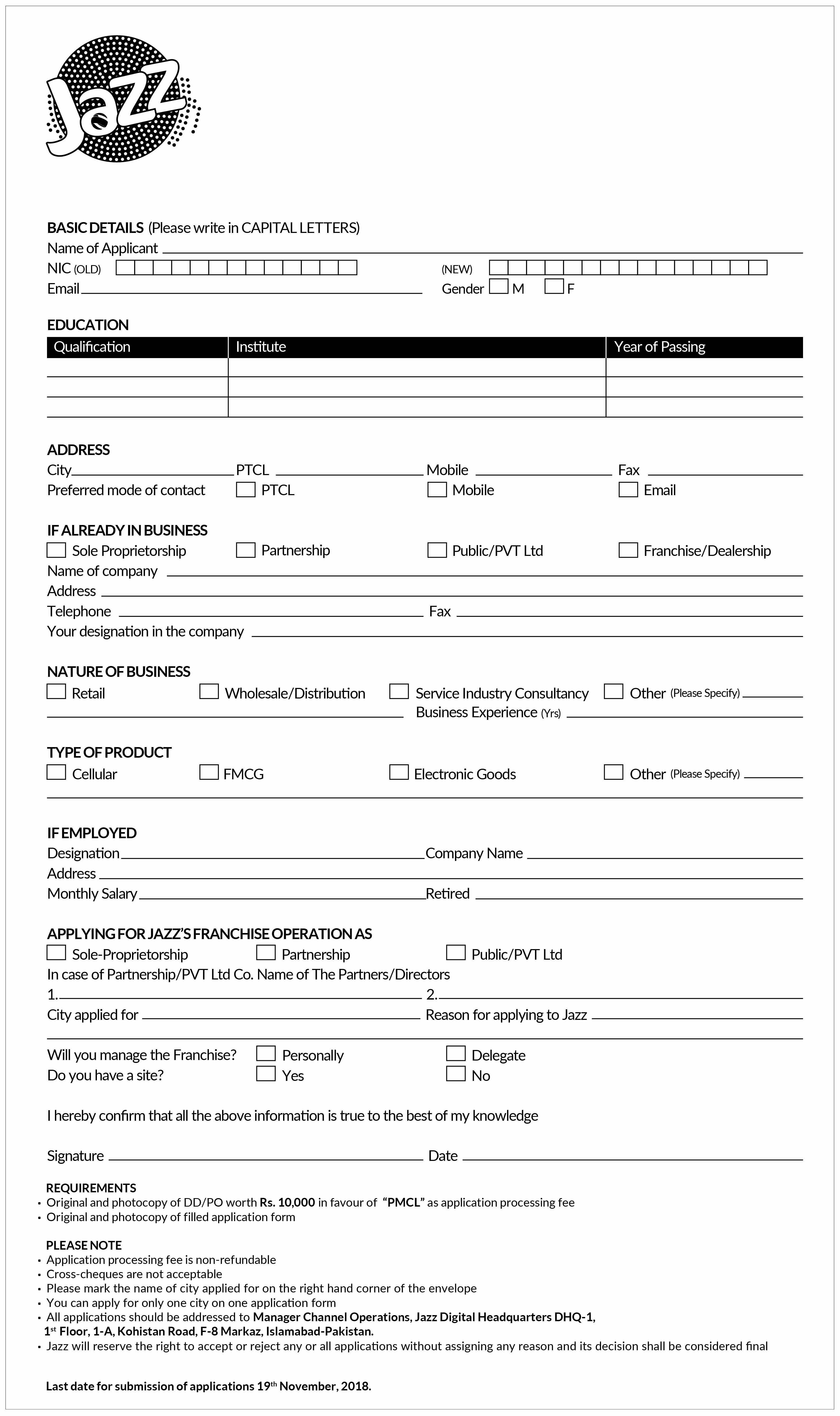 Jazz Company is looking for experienced & qualified candidates for the posts of Distributor in Karachi, Peshawar, Multan, Wazirabad, Sargodha, Sheikhupura, Muridke, Talagang, Chakwal, Khanpur, Kot Samaba, Rahim Yar Khan. Interested candidates can contact on given details for more information. Candidates have to submit non refundable fee.