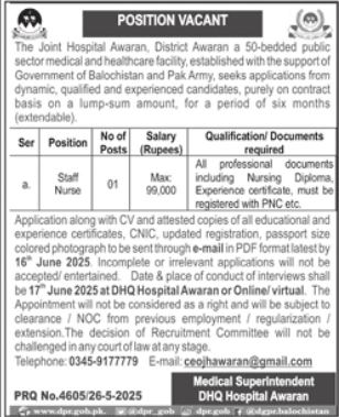 Joint Hospital jobs advertisement dated about 27 May 2025 in daily Jang Newspaper invites application for the vacant post of staff nurse in Awaran, awaran Balochistan Pakistan. Candidates with Bachelor and Intermediate etc. educational background will be preferred.