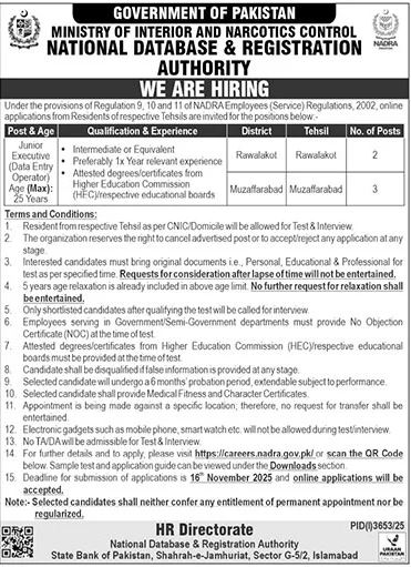 Ministry of Interior and Narcotics Control G-5 Islamabad, islamabad Islamabad Pakistan invites applications from eligible candidates for the post of jr executive data entry operator as per advertisement of November 3, 2025 published in daily The News Newspaper. Intermediate etc. educational qualification will be preferred.
