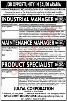 Julyal Corporation Madina, makkah Saudi Arabia invites applications from eligible candidates for the post of industrial manager, product specialist and maintenance manager as per advertisement of March 31, 2024 published in daily Jang Newspaper. Preferred Education is Bachelor and B.E etc.