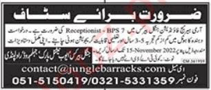 Jungle Barracks jobs advertisement dated about 6 November 2022 in daily Jang Newspaper invites application for the vacant post of receptionist in Rawalpindi, rawalpindi Punjab Pakistan. Preferred Education is Intermediate and Bachelor etc.