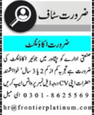 Frontier Platinum Group Peshawar, peshawar Khyber Pakhtunkhwa KPK Pakistan invites applications from eligible candidates for the post of accountant as per advertisement of February 17, 2024 published in daily Mashriq Newspaper. Educational qualifications required Bachelor, I.com and B.com etc.