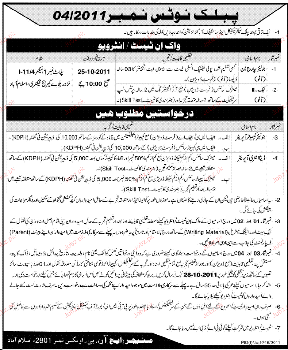 Apply as per details in job advertisement. Login to view further details of how to apply via https://www.jobz.pk online.