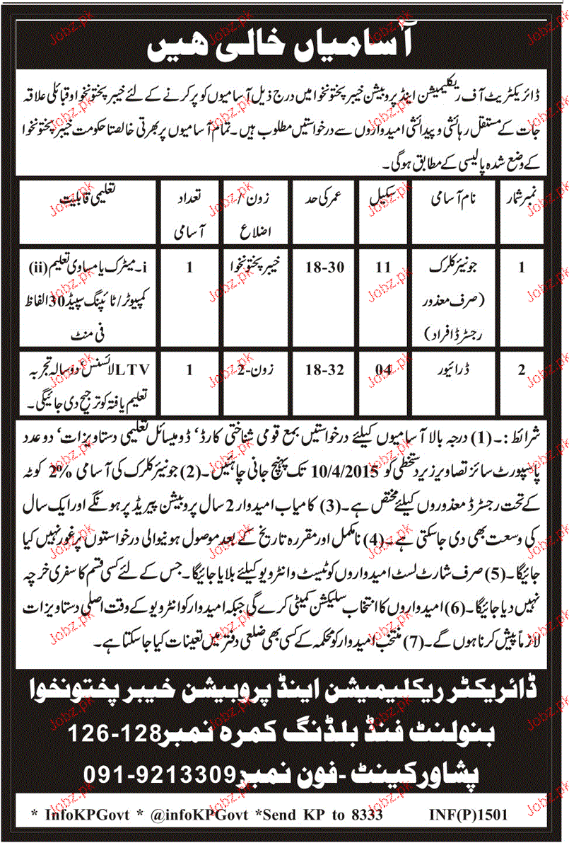 Latest Government Department Admin Clerical Posts Peshawar 2025