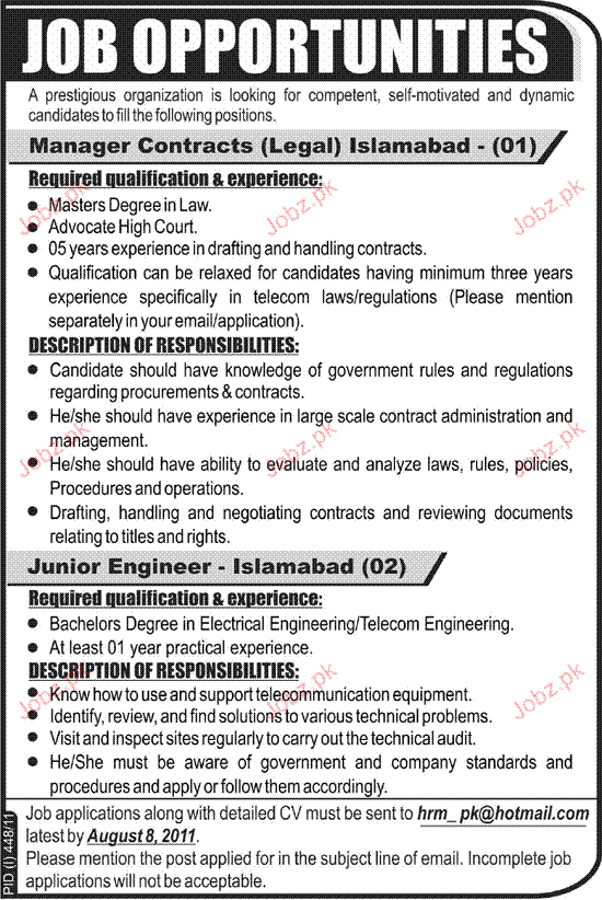 Apply as per details in job advertisement. Login to view further details of how to apply via https://www.jobz.pk online.