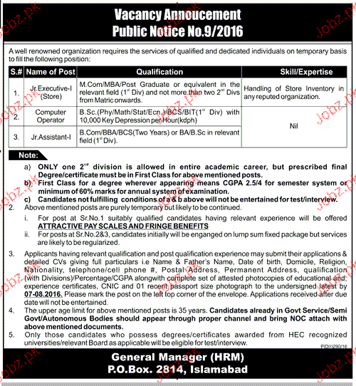 Apply as per details in job advertisement. Login to view further details of how to apply via https://www.jobz.pk online.