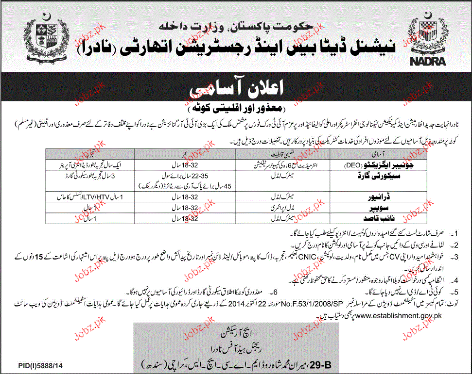 Junior Executives, Security Guards, Drivers Job In NADRA
