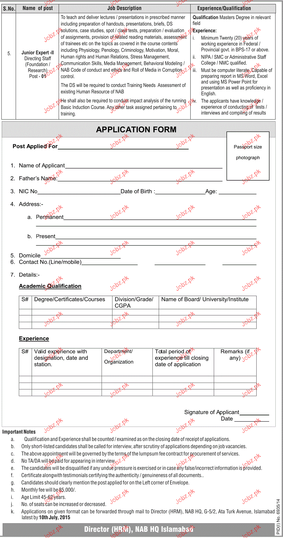 Apply as per details in job advertisement. Login to view further details of how to apply via https://www.jobz.pk online.