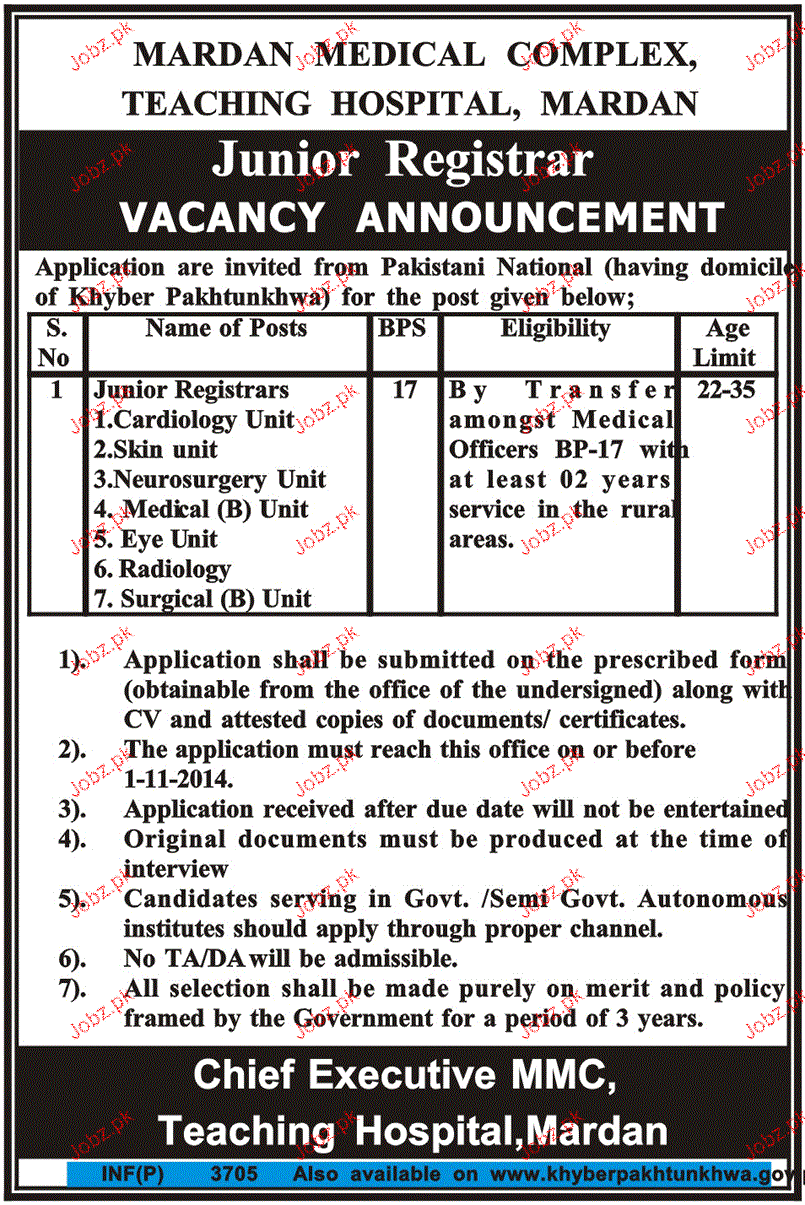 Junior Registrar Job In Mardan Medical Complex Teaching Hosp