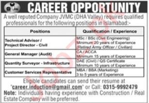Private Company jobs advertisement dated about 25 September 2022 in daily Jang Newspaper invites application for the vacant post of quantity surveyor, project director, customer services representative, technical advisor and general manager audit in Islamabad, islamabad Islamabad Pakistan. Persons with M.sc, MBA, DAE, BBA, CA, Master and ACCA etc. education can apply.