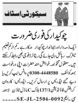 Kaarvan Crafts Foundation jobs advertisement dated about 8 June 2025 in daily Jang Newspaper invites application for the vacant post of chowkidar and watchman in Model Town - Block C Lahore, lahore Punjab Pakistan. Persons with Middle and Matric etc. education can apply.
