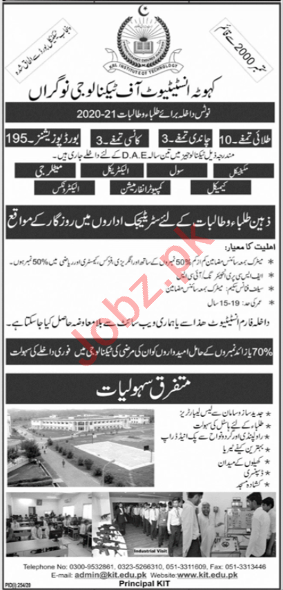 Kahuta Institute Of Technology KIT Kahuta, Pakistan is starting admissions fall 2020 for the classes of DAE Mechanical, Civil, Electrical, Chemical, Electronics Engineering. Read newspaper ad for exact details.