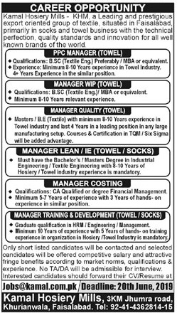 Kamal Hosiery Mills is looking for highly qualified and experienced candidates for the posts of PPC Manager, Manager WIP, Manager Quality, Manager Lean, Manager IE, Manager Costing, Manager Training, Manager Development in Faisalabad. Candidates can apply till June 20, 2019.