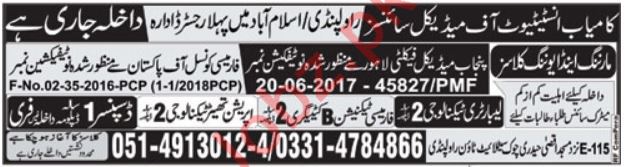 Kamyab Institute of Medical Sciences is offering admissions for Laboratory Technology Diploma, Pharmacy Technician Diploma, Operation Theater OT Technology Diploma, Dispenser Diploma in Rawalpindi. Read newspaper ad for exact details.