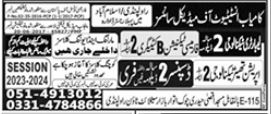 Kamyab Institute of Medical Sciences Laboratory Technology, Pharmacy Technician, Operation Theatre Technology, Dispenser admissions 2023 has been announced. Eligible students can apply for academic admissions 2023 in Kamyab Institute of Medical Sciences Rawalpindi Punjab Pakistan for Medical College. Eligible students for fulfilling criteria for admissions in Diploma can enroll as per Private admission policy 2023 till closing date 18 July 2023. Read newspaper ad for exact details.