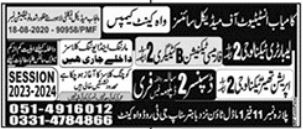 Kamyab Institute of Medical Sciences laboratory technology, pharmacy technician, B.Pharmacy, Operations Theater Technology, Dispenser admissions 2023 has been announced. Kamyab Institute of Medical Sciences Wah Cantt Punjab Pakistan welcomes students to apply for admissions in academic year 2023 in Medical Medical College. Students who want to enroll for academic session 2023 in Course, Diploma and B Pharmacy qualification and admission criteria for Private institute can apply till last date 12 March 2023. Read newspaper ad for exact details.