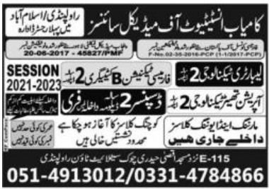 Kamyab Institute of Medical Sciences Laboratory Technology, Operation Theatre Technology, Dispenser, Pharmacy Technician Category B. admissions 2022 has been announced. Eligible students can apply for academic admissions 2022 in Kamyab Institute of Medical Sciences Rawalpindi Punjab Pakistan for Medical Course. Students who want to enroll for academic session 2022 in Course qualification and admission criteria for Private institute can apply till last date 31 October 2022. Read newspaper ad for exact details.