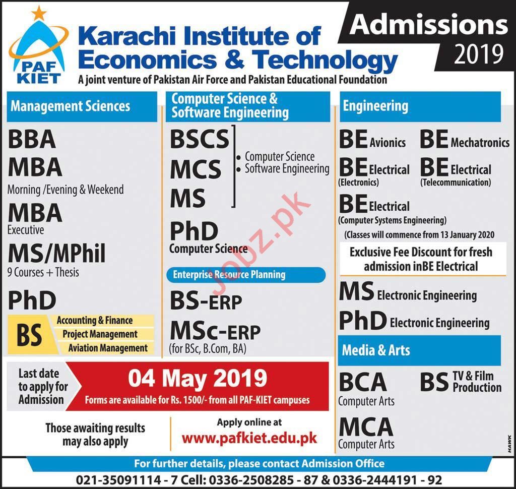 Karachi Institute of Economics & Technology is a joint venture of Pakistan Air Force and Pakistan Educational Foundation has announced Admissions for the degree of Bachelor, Master in Karachi. Read newspaper ad for exact details.