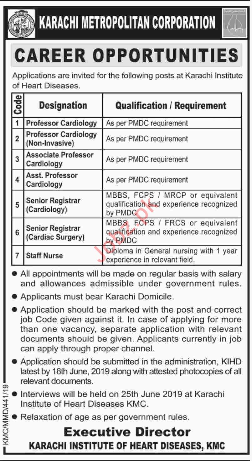 Karachi Metropolitan Corporation KMC, Karachi Institute of Heart Diseases KIHD, Government of the Sindh are seeks candidates for the posts of Professor, Professor Cardiology, Associate Professor, Associate Professor Cardiology, Assistant Professor, Registrar, Registrar Cardiology, Registrar Cardiac Surgery, Nurse .