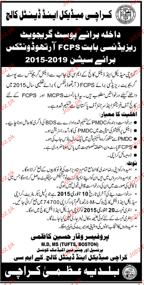 Karachi Medical and Dental College Admission in FCPS in Karachi. Read newspaper ad for exact details.