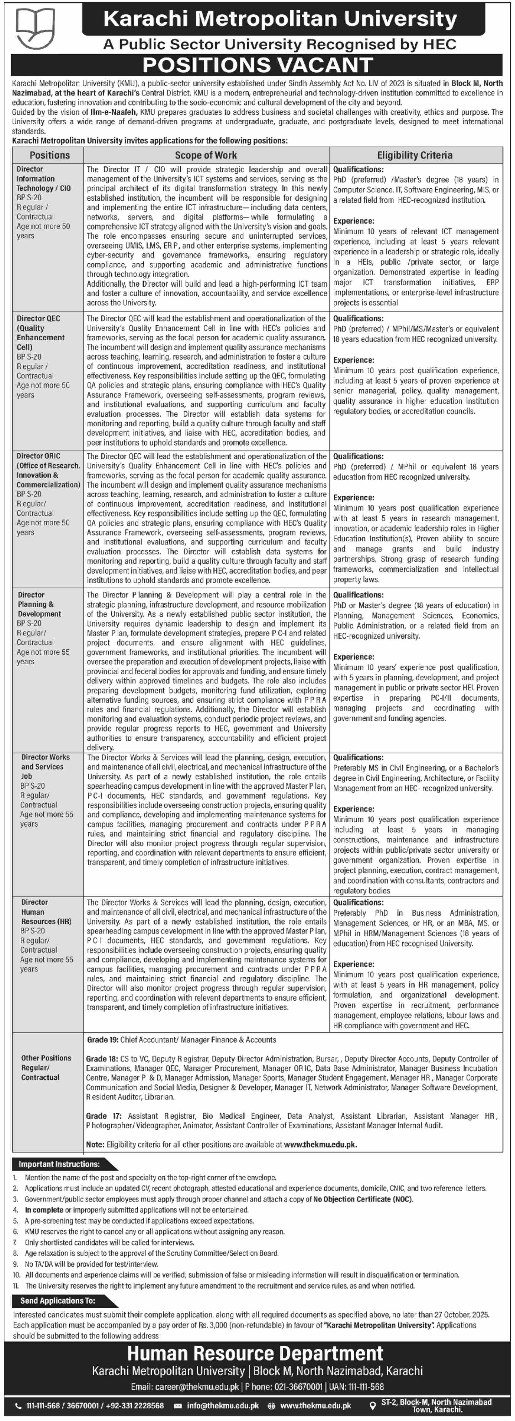 Vacancies in Karachi Metropolitan University KMU Advertisement October 2025