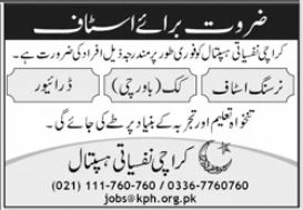 Karachi Psychiatric Hospital KPH jobs advertisement dated about 20 October 2024 in daily Jang Newspaper invites application for the vacant post of driver, cook and nursing staff in Karachi, karachi Sindh Pakistan. Candidates with Middle and Matric etc. educational background will be preferred.