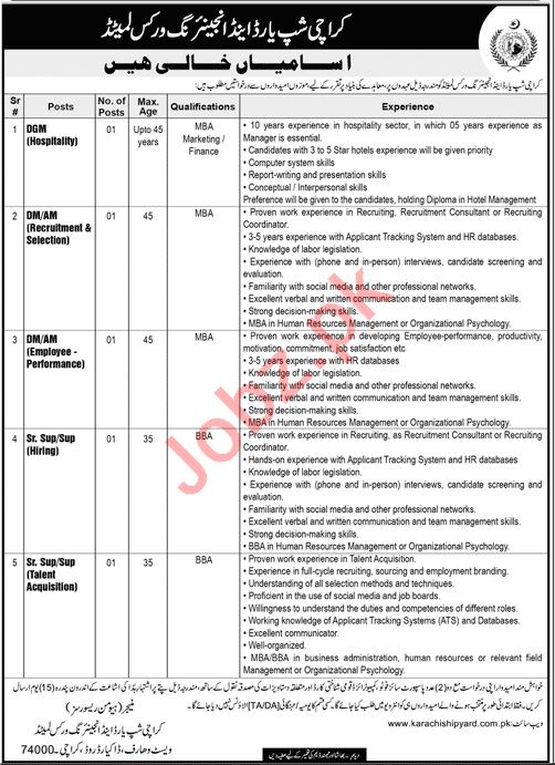 Karachi Shipyard and Engineering Works Limited is looking for highly qualified & experienced candidates for the posts of DGM Hospitality, DM Recruitment & Selection, AM Recruitment & Selection, DM Employee Performance , aM Employee Performance, Sup Talent Acquisition, Sr Sup Talent Acquisition, Sup Hiring, Sr Sup Hiring in Karachi. Interested candidates can contact on given details.