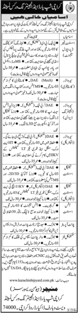 Karachi Shipyard and Engineering Works Limited is hiring technical candidates for the posts of Assistant Manager Purposal Management, Supervisor Carpentry, Supervisor Engineering Design, Supervisor Electrical, Technical Assistant, Office Assistant, Plant Operator, Mechanical Fitter in Karachi.