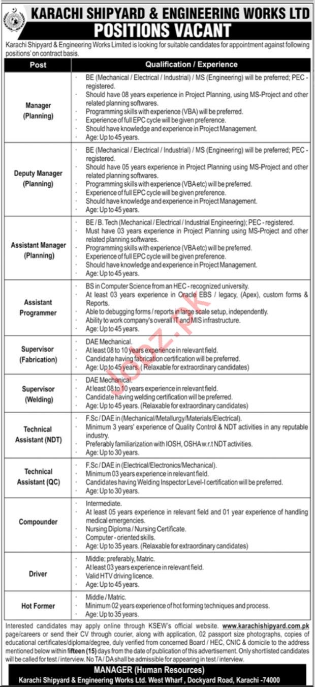 Karachi Shipyard and Engineering Works Limited is looking for candidates for following posts as per job advertisement published in daily Jang Newspaper of September 11, 2022 for location Karachi, karachi Sindh Pakistan: