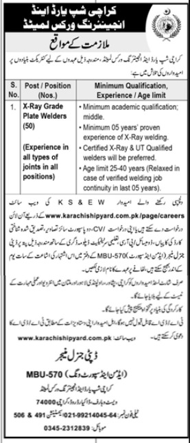 Vacant posts including x ray grade plate welder are announced in Karachi Shipyard and Engineering Works Limited Karachi, karachi Sindh Pakistan as per 10 November 2024 advertisement in daily Jang Newspaper. Educational qualifications required Intermediate and Bachelor etc.
