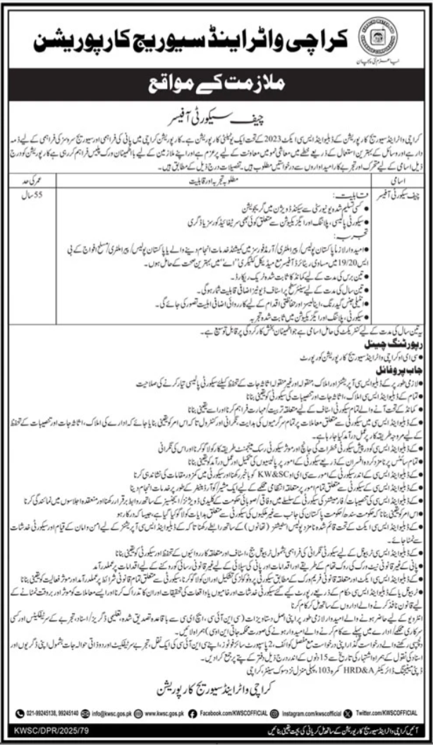 Karachi Water & Sewerage Corporation KWSC Karachi, karachi Sindh Pakistan invites applications from eligible candidates for the post of chief security officer as per advertisement of December 9, 2025 published in daily Jang Newspaper. Persons with Bachelor, Master and MS etc. education can apply.