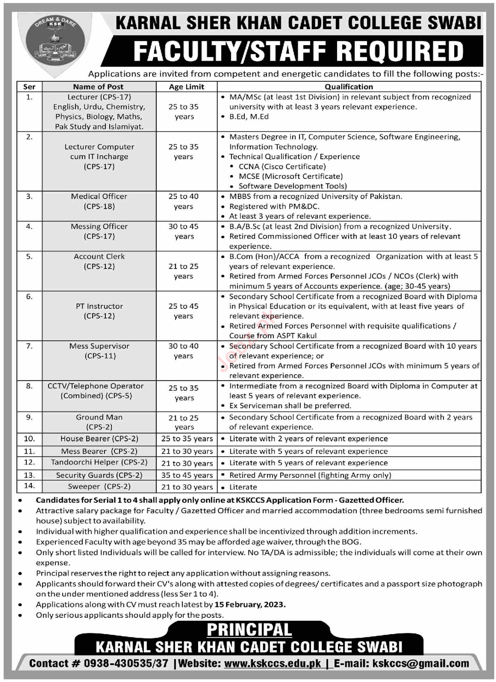 Karnal Sher Khan Cadet College Swabi jobs advertisement dated about 29 January 2023 in daily Dawn Newspaper invites application for the vacant post of pt instructor, lecturer physics, cctv operator, lecturer english, lecturer maths, lecturer chemistry, lecturer islamiyat, tandoorchi helper, lecturer biology, lecturer computer science, lecturer, messing officer, gound man, it incharge, medical officer, house bearer, mess supervisor, sweeper, telephone operator, security guard, lecturer pak study, lecturer urdu, mess bearer and accounts clerk in Swabi, swabi Khyber Pakhtunkhwa KPK Pakistan. Candidates with Master, BA, MA, MCS, B.ed, Matric, Intermediate, M.sc, Primary, M.ed, Bachelor, MIT, B.com and Middle etc. educational background will be preferred.