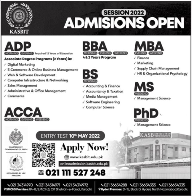Khadim Ali Shah Bukhari Institute of Technology KASBIT ADP, Associate Degree Program, BBA, BS, MBA, MS admissions 2022 has been announced. Eligible students who qualify as per admission criteria in Khadim Ali Shah Bukhari Institute of Technology KASBIT Karachi Sindh Pakistan can apply in Management University for academic year 2022. Students who want to enroll for academic session 2022 in MBA, Master, MS, BBA, BS and Bachelor qualification and admission criteria for Government institute can apply till last date 10 May 2022. Read newspaper ad for exact details.
