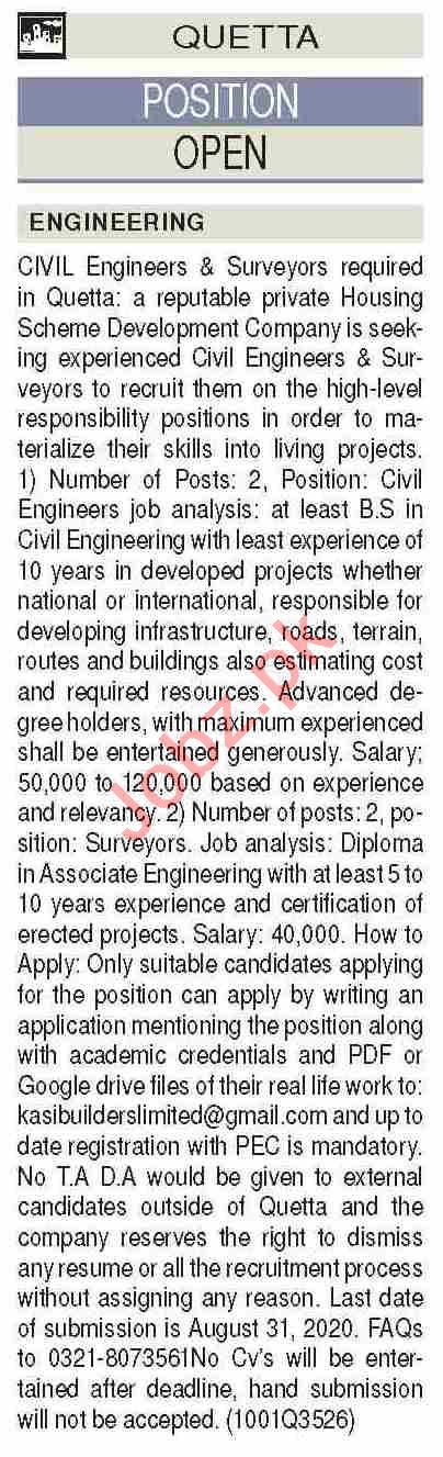 Kasi Builders Quetta Jobs 2020 Civil Engineer & Surveyor