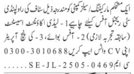 Vacant posts including account assistant, accountant, office boy, key punch operator and lady accountant are announced in Private Company Rawalpindi, rawalpindi Punjab Pakistan as per 16 May 2025 advertisement in daily Jang Newspaper. Candidates with BBA, BA, Matric, B.com, Bachelor and Intermediate etc. educational background will be preferred.